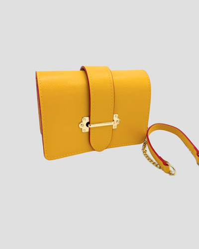 Le sac Valentina en cuir Palmellato et de couleur jaune se veut pratique et élégant grâce à son mini format rectangulaire et son cuir robuste. Vous pourrez opter pour un porté épaule ou croisé grâce à la bandoulière et également un porté à la ceinture. Son fermoir métallique original tenu par une bande de cuir vous assure sécurité et une touche sophistiquée !