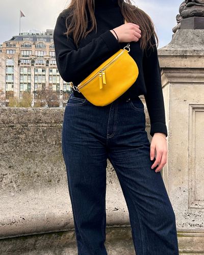 Yellow, a warm and stimulating color, which will brighten up your outfitwith your leather handbag.
